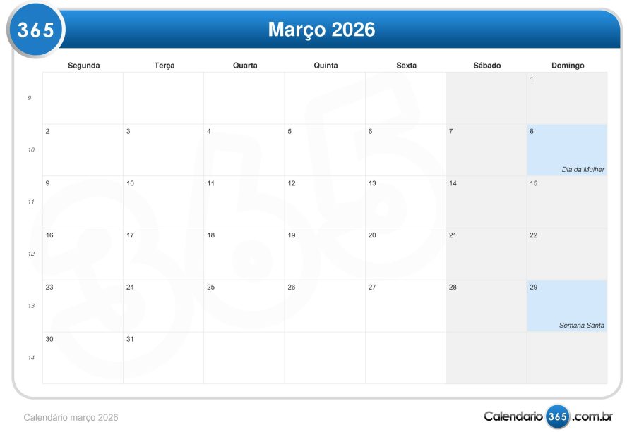 Calendario março 2026 — guia rápido do mês