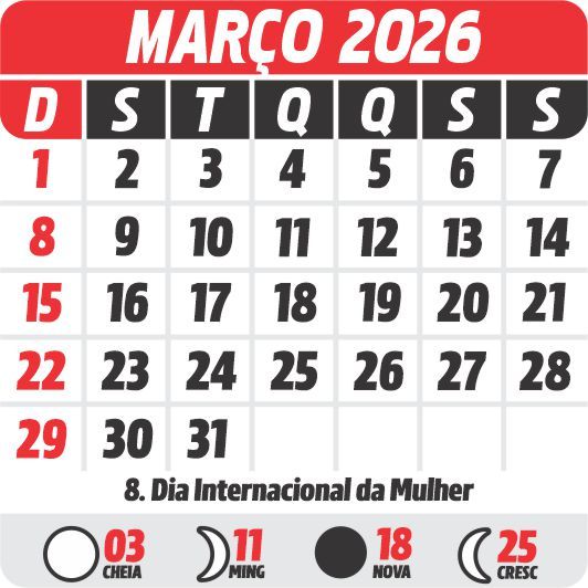 Março de 2026 tem 31 dias. O mês começa no domingo, 1º de março, e termina na terça-feira, 31 de março. Com início em domingo, os sábados do mês caem em 7, 14, 21 e 28; os domingos em 1, 8, 15, 22 e 29, totalizando 9 dias de fim de semana.