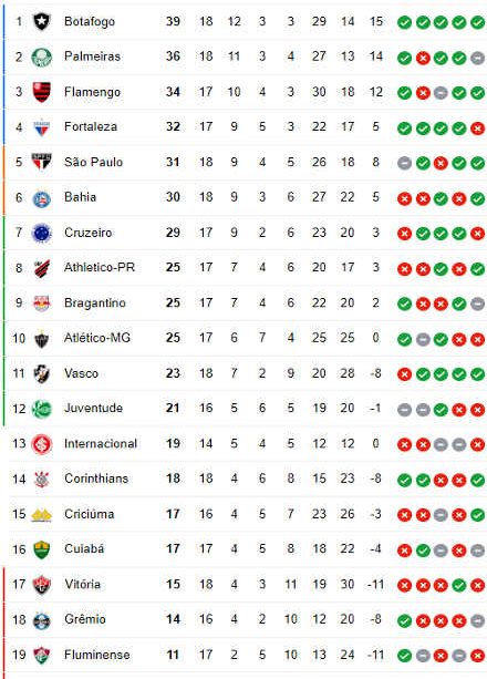 Atualmente, a equipe do Botafogo lidera a tabela com 62 pontos, seguida pelo Palmeiras com 58. Times como o Flamengo e o São Paulo estão lutando na parte de cima da tabela, enquanto que clubes tradicionais como Grêmio e Cruzeiro enfrentam o desafio de evitar o rebaixamento. A competição é particularmente intensa neste ano, com várias mudanças nas técnicas e jogadores, tornando cada jogo crucial para as aspirações de cada equipe.