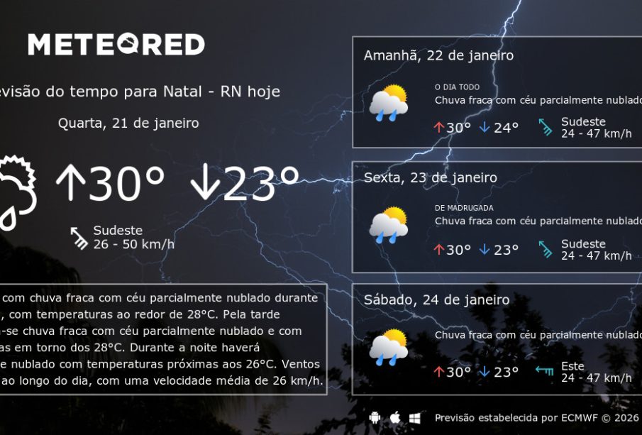 A previsão do tempo para hoje é de temperaturas entre 24° e 30° e com possibilidade de chuva em Natal – RN. Durante a manhã, espera-se chuva fraca com céu parcialmente nublado, com temperaturas ao redor de 28°C, e ventos do Sudeste com velocidade média de 27 km/h. As condições climáticas típicas do verão nordestino trazem umidade moderada e períodos de céu nublado intercalados com sol.