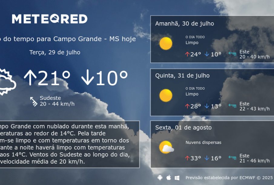De acordo com o Instituto Nacional de Meteorologia (INMET), a previsão para os próximos dias em Campo Grande indica a permanência de temperaturas elevadas, com máximas variando entre 30°C e 35°C. A umidade do ar tende a ser baixa, o que pode acarretar desconforto térmico e necessitar de atenção especial à hidratação.