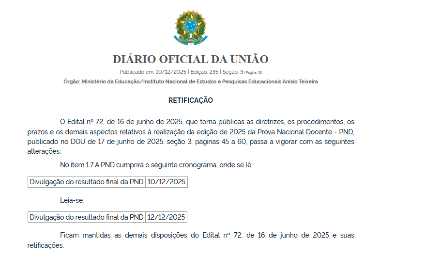 De acordo com o comunicado, os resultados, tanto da aplicação regular quanto da reaplicação, que seriam publicados nesta quarta-feira (10), agora serão divulgados na próxima sexta-feira, 12 de dezembro. O resultado final da Prova Nacional Docente (PND) será publicado no dia 12 de dezembro de 2025. Inicialmente, isso estava previsto para ocorrer no dia 10 de dezembro, mas o documento foi retificado.