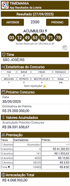 O resultado da Timemania continua a ser um assunto de grande interesse entre os apostadores brasileiros. As emoções dos sorteios e as esperanças de ganhar prêmios significativos, enquanto se apoia o futebol nacional, fazem dessa loteria uma opção sempre atrativa. Continue acompanhando os resultados e boas apostas!